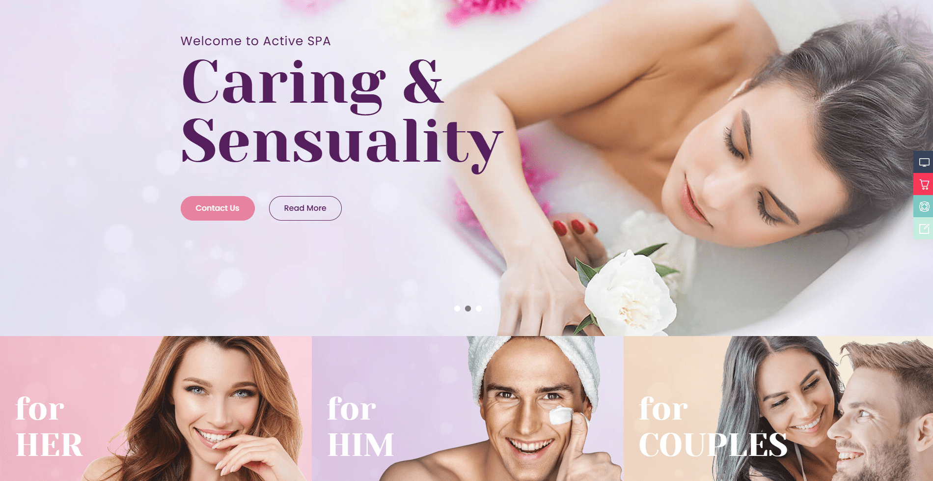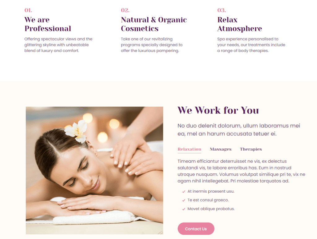 Service Highlights | To present key service pillars or categories | Three columns with images + headlines (“Care & Comfort”, “Rest & Pleasure”, etc.) |