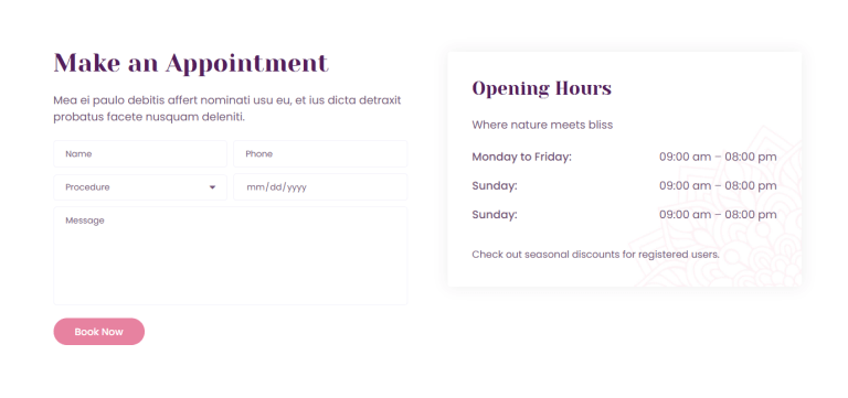Contact / Booking Form | Facilitate user inquiries or bookings | Web form capturing name, phone, date, message, and service selection |