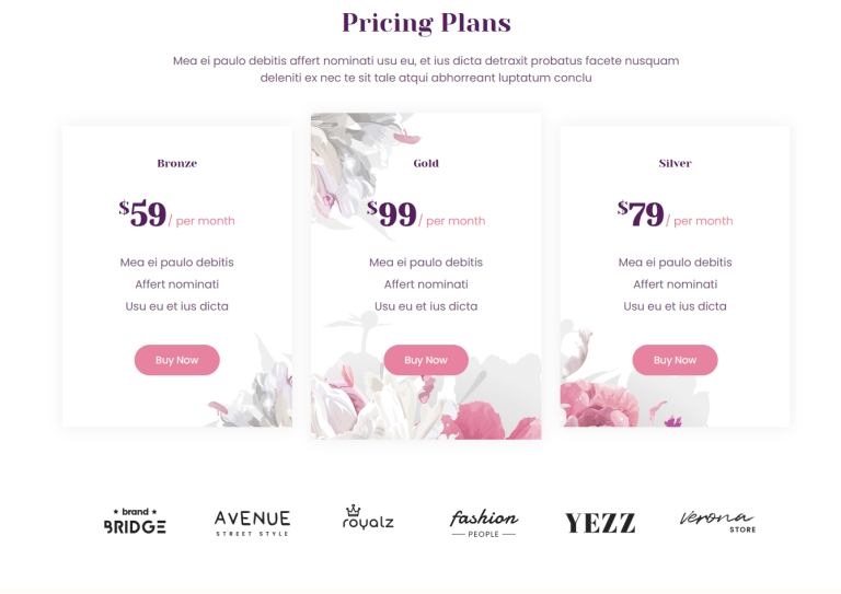 Pricing Plans | Present subscription / package options | Tiered pricing cards (Bronze, Silver, Gold) with “Buy Now” buttons |
